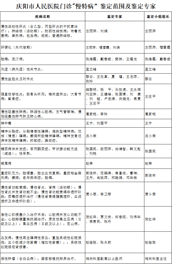 庆阳市人民医院门诊"慢特病”鉴定范围及鉴定专家
