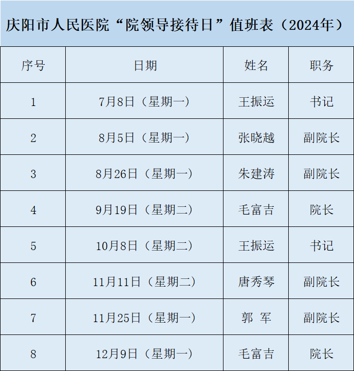 现将庆阳市人民医院“院领导接待日”具体情况公告如下: