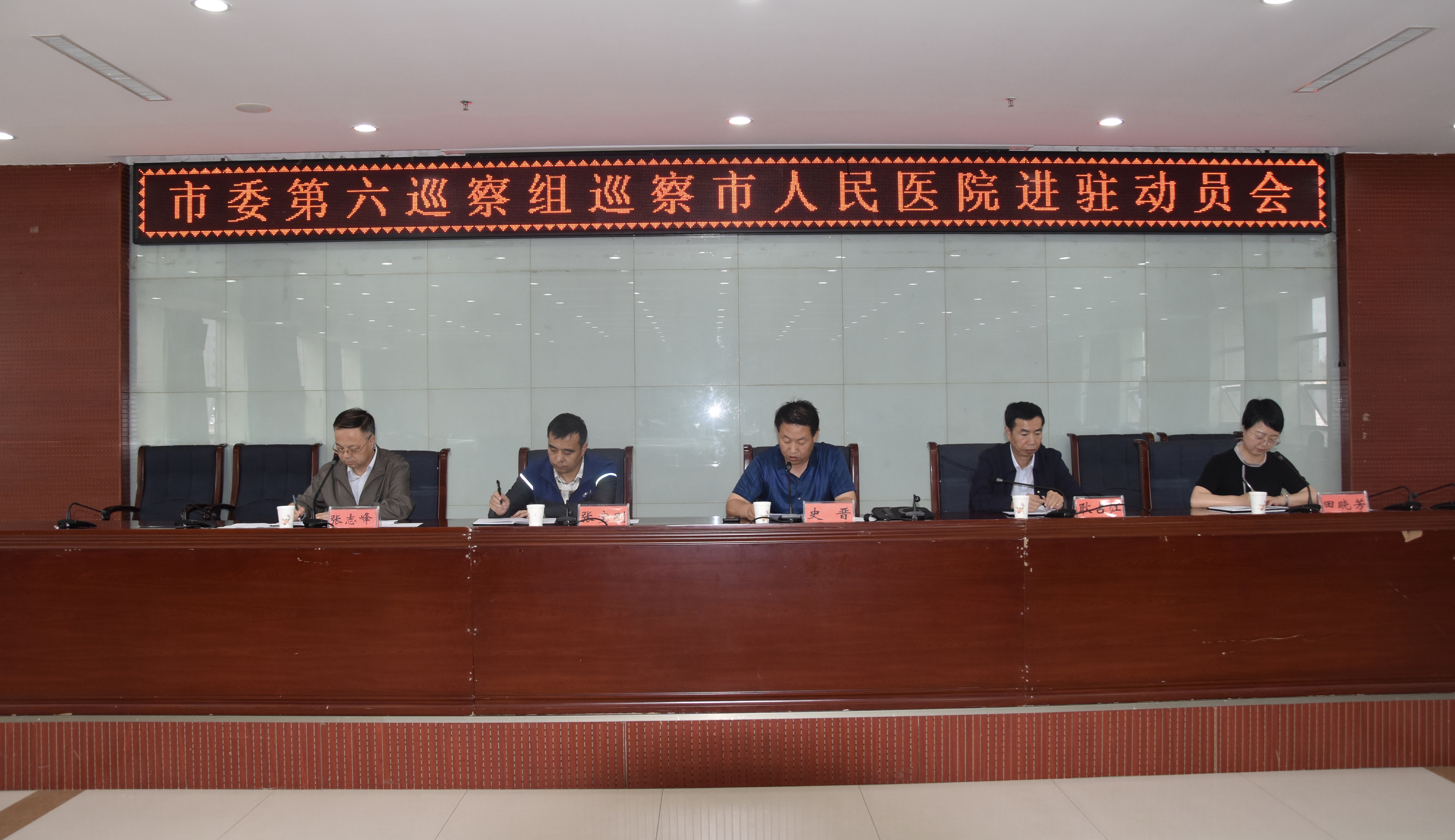 8月27日,市委第六巡察组巡察市人民医院进驻工作会在市人民医院门诊楼六楼会议室召开。根据市委安排,市委第六巡察组将对市人民医院开展为期3个月的巡察。史晋出席会议并讲话,巡察组全体成员出席会议,市人民医院院长张志峰主持会议,党委书记田晓芳表态发言。市人民医院285人参加了会议。