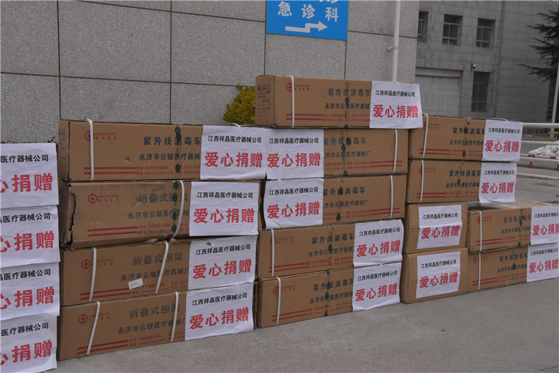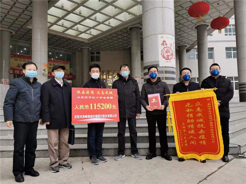 2月6日,庆阳市西峰瑞信村镇银行股份有限公司通过庆阳市红十字会向庆阳市人民医院捐赠人民币115200元;江西祥晶医疗器械有限公司为庆阳市人民医院捐赠医用一次性隔离衣500套、乳胶医用一次性手套2000双、医用护目镜200副、医用移动式紫外线消毒灯10台等医用物资。