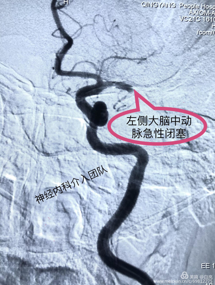 初步诊断:急性脑梗死。治疗策略:静脉溶栓桥接血管内介入治疗。立即给予阿替普酶静脉溶栓,同时前往导管室行脑血管造影,造影提示左侧大脑中动脉M1段闭塞。即刻行“颅内动脉机械取栓术”。手术历时1小时,完全开通血管,患者安返病房。