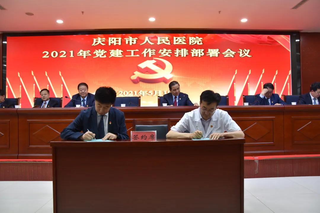 新一届院党委召开了2021年党建工作安排部署会议,会议签订了《2021年党建工作目标管理责任书》、《2021年意识形态工作目标管理责任书》、《2021年党风廉政建设和反腐纠风工作目标管理责任书》。王长平同志解读了《庆阳市人民医院2021年党建工作要点》。