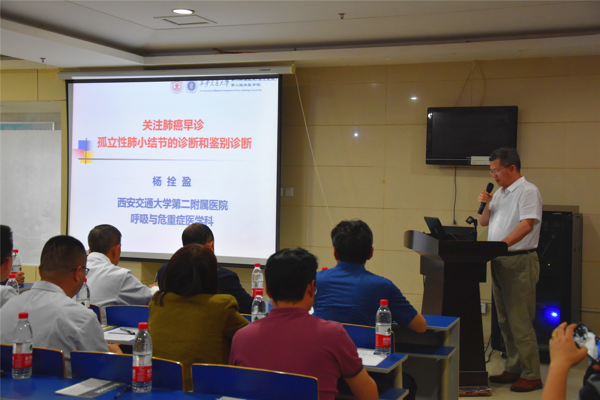杨栓盈教授以《关注肺癌早诊——孤立性肺小结节的诊断和鉴别诊断》为题做学术讲座。我院胸心外科、呼吸科、肿瘤科、放疗中心的青年医师分别做病例分享,现场各学科专家进行了热烈的病例讨论。