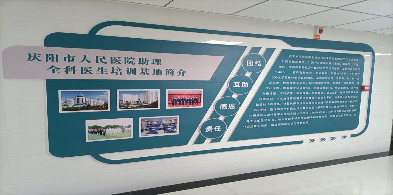 庆阳市人民医院助理全科医生培训基地是2016年全省首批国家培训基地,经过近几年的不断投入建设,已建成集临床示教、技能操作、综合考核等多功能培训基地。目前,基地占地面积约1.46万㎡,拥有各种教学、培训仪器、设备200余件,基地配有内科、骨外科、妇儿科、急诊急救、护理技能实训室,配有体格检查室、穿刺室、模拟病房、模拟门诊等,拥有理论培训室4间、多媒体教室1间。培训基地可广泛开展物理诊断、专科技能、基础操作、急救技能、重症监护、临床思维等多项技能培训,可同时对200名学员进行临床技能训练,可实施计算机辅助诊断技能的训练和考核、临床综合诊断和治疗技能的培训考核、计算机微创虚拟训练系统能进行内科各种穿刺等专科技能培训和考核。蕴含全科医生培训教学大纲内所有的临床技能培训项目,为提升学员的临床诊疗思维和技能实践水平提供了良好的平台。